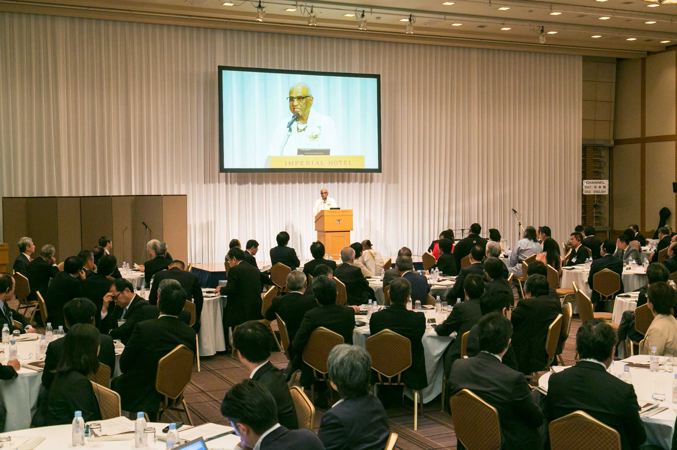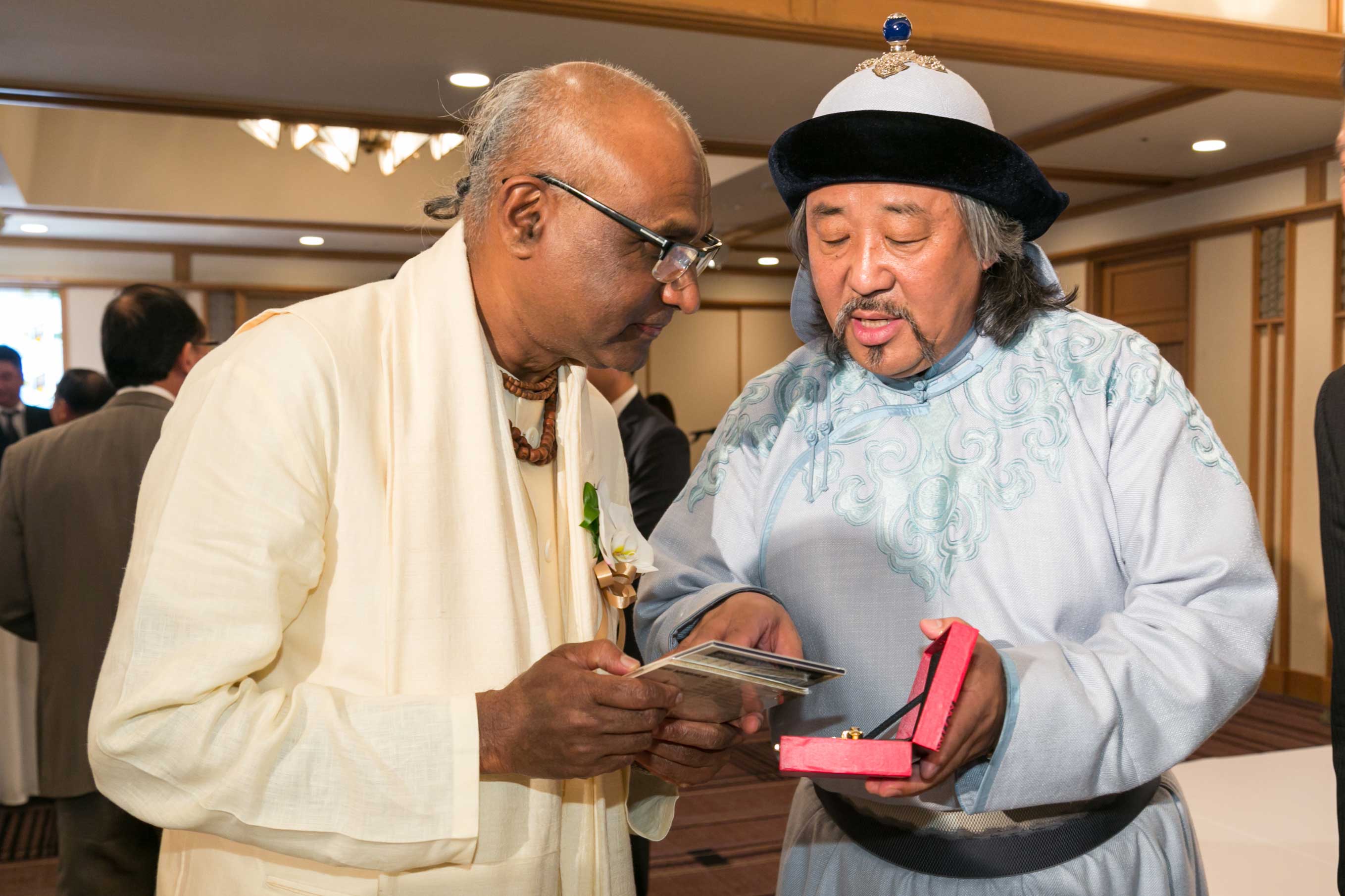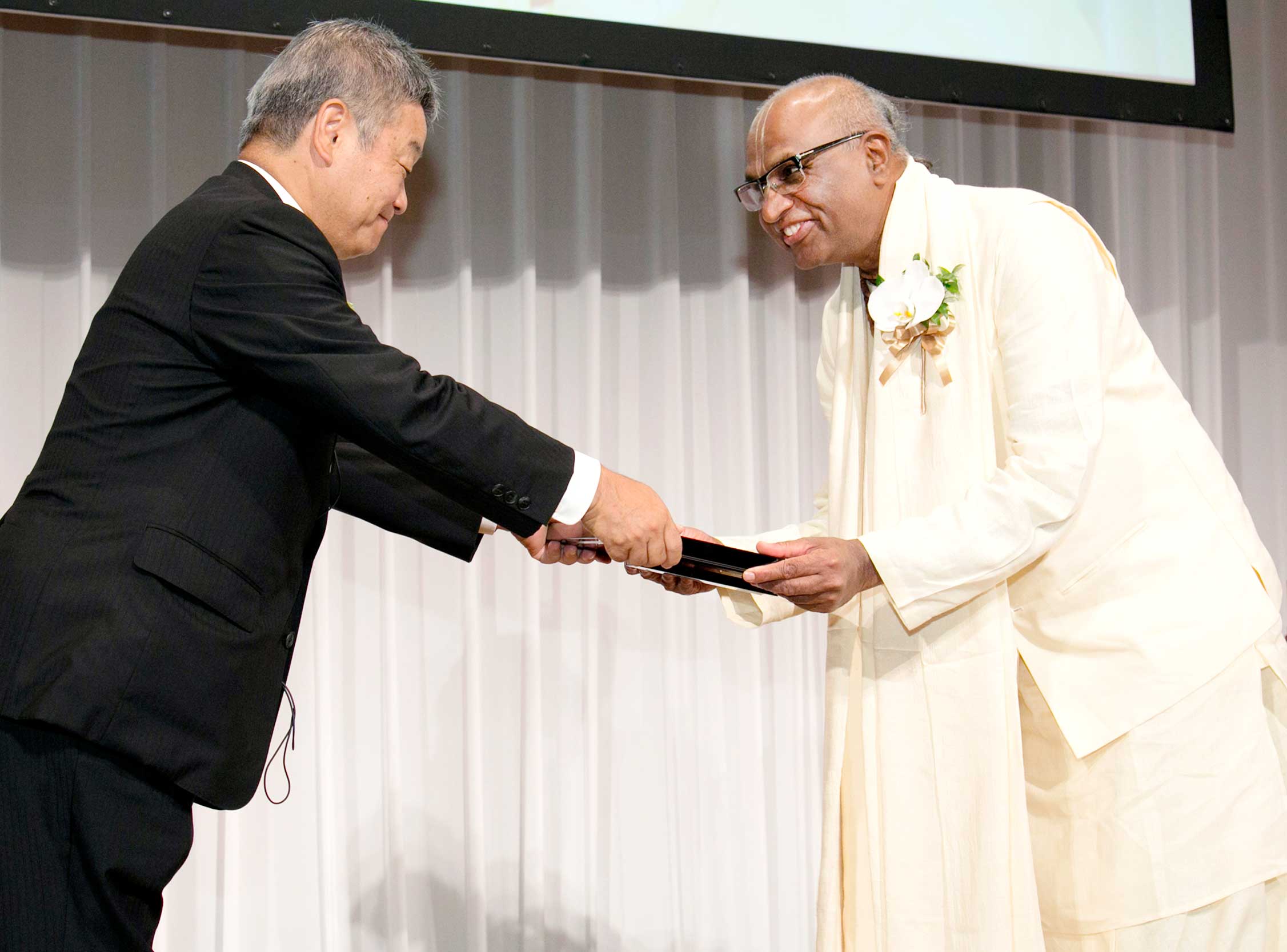 Madhu Pandit Dasa, Chairman of The Akshaya Patra Foundation receives the Nikkei Asia Prize on Sunday, May 29 in Tokyo. Naotoshi Okada, President, CEO of Nikkei Inc. presents the award at the ceremony.