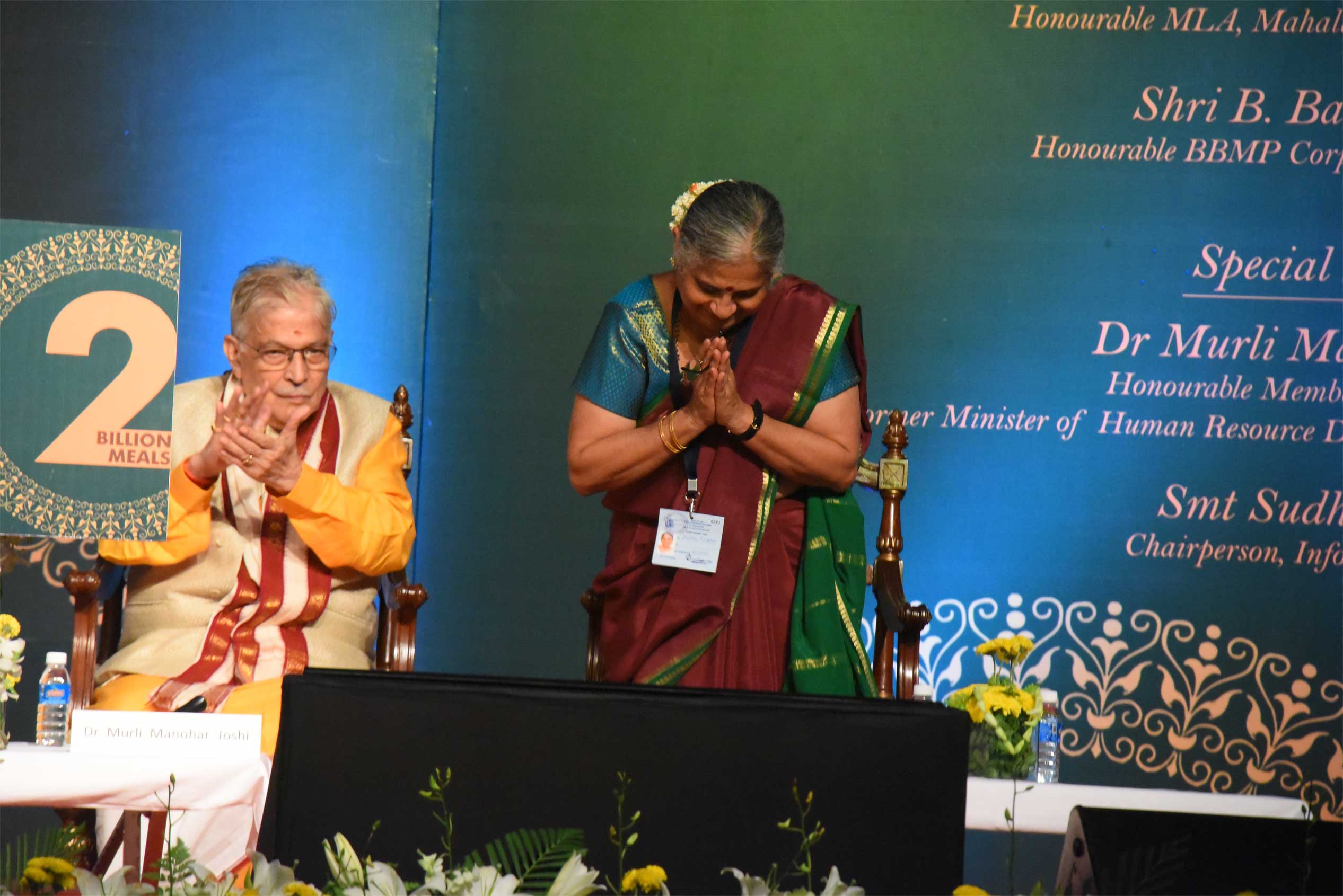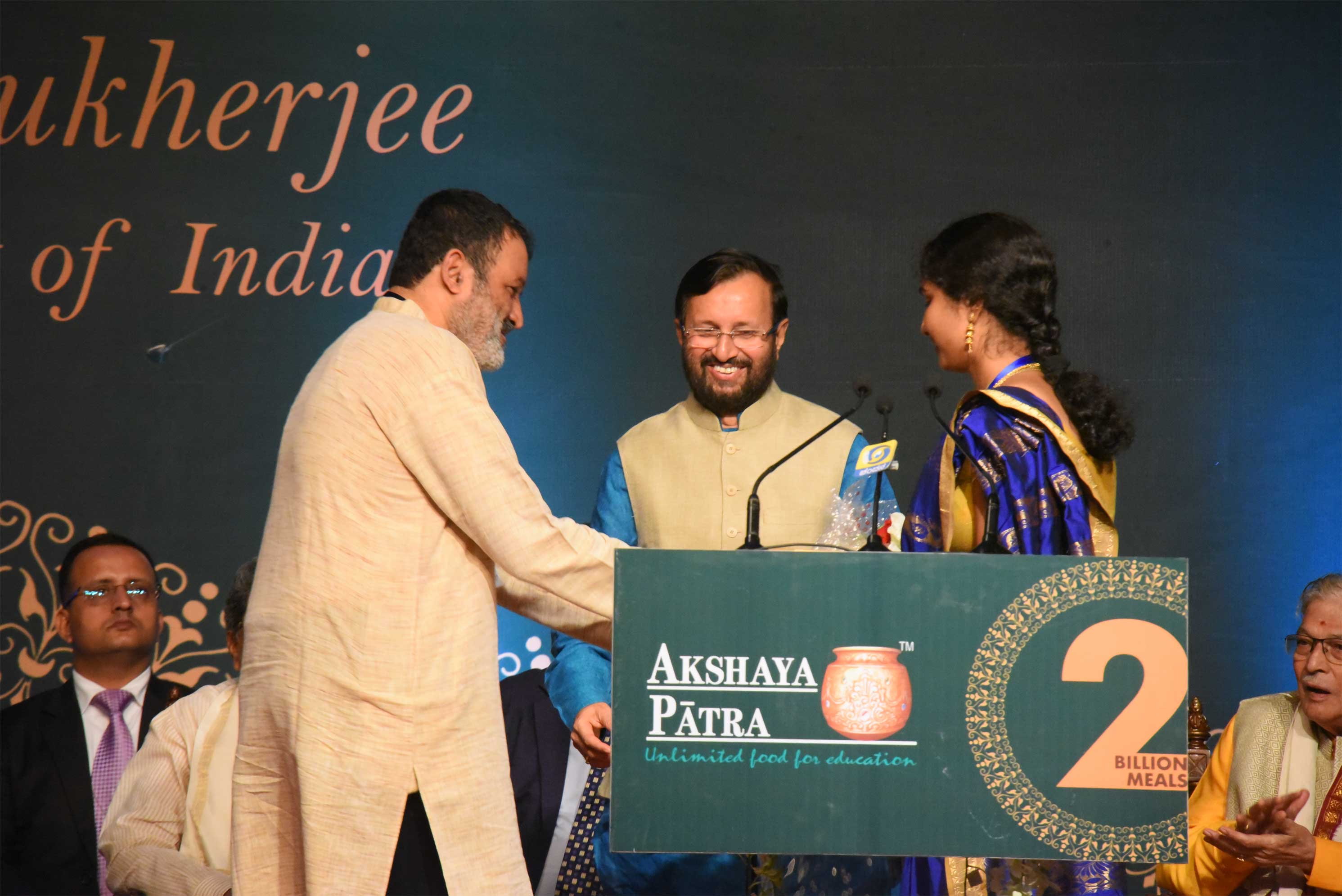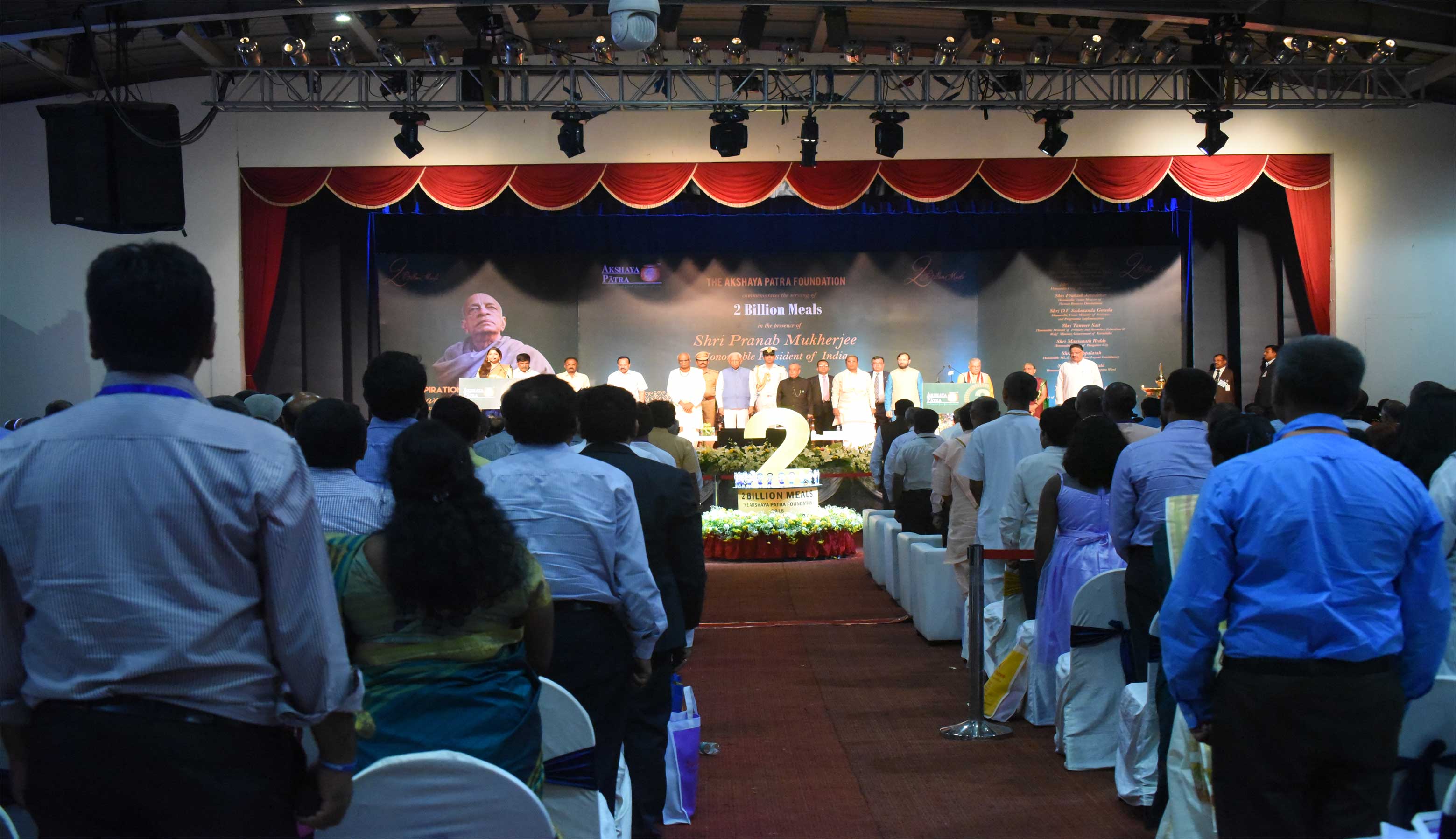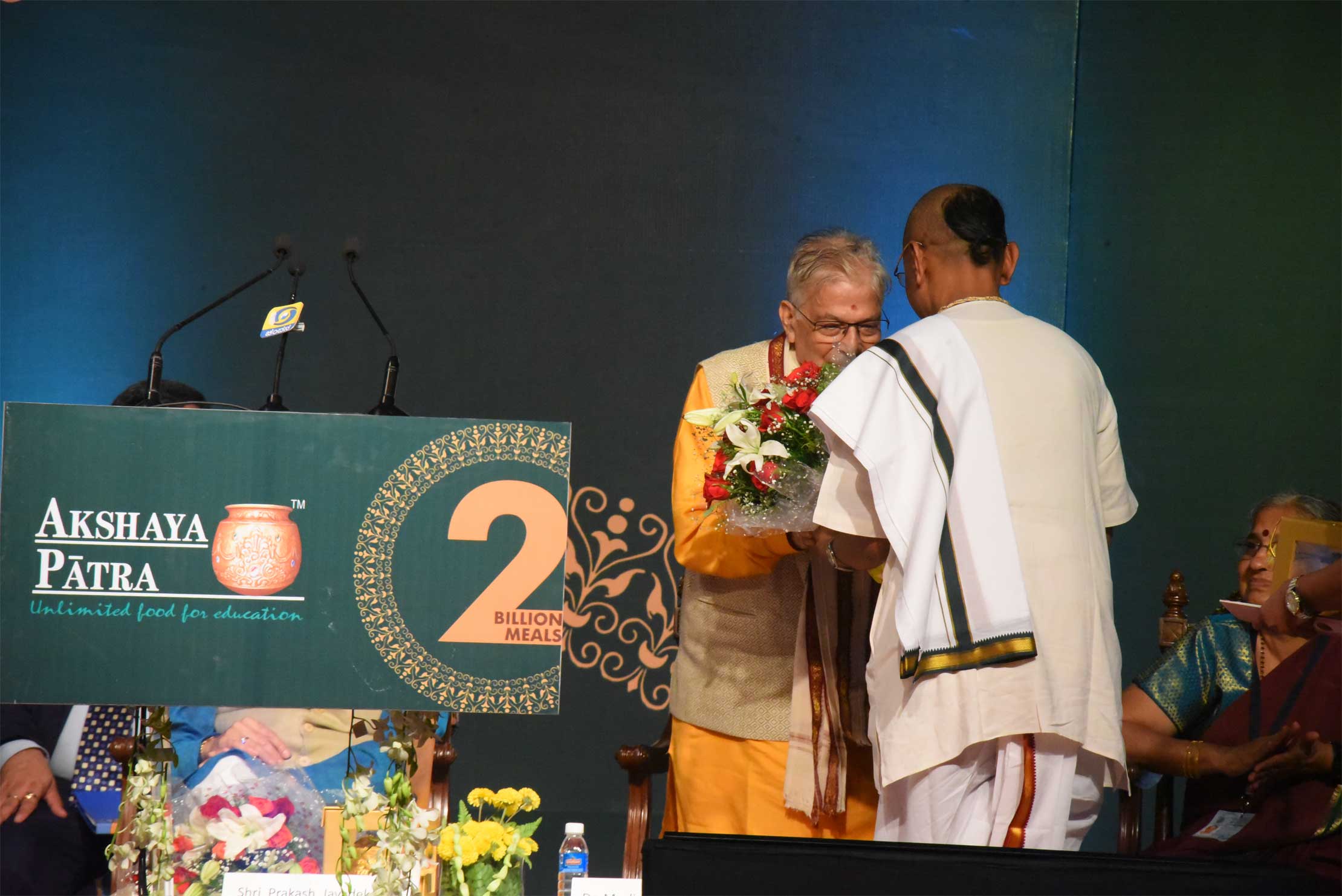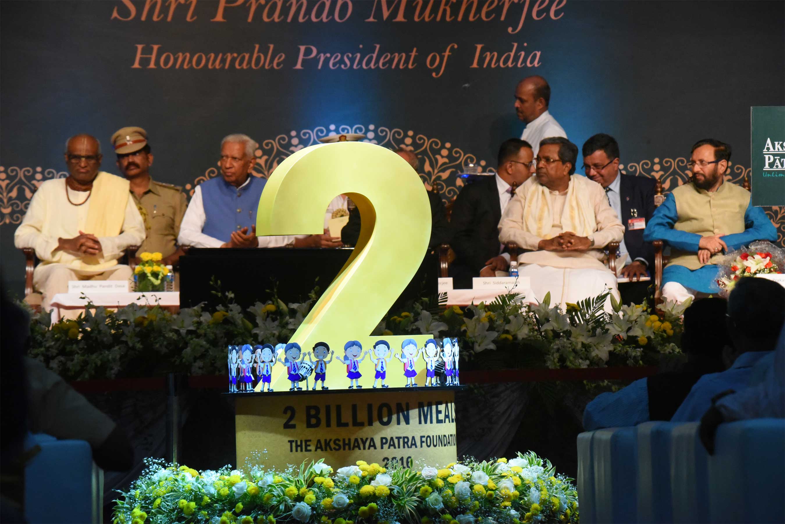 Dignitaries present on stage during the event held to commemorate Akshaya Patra's 2 billion meals