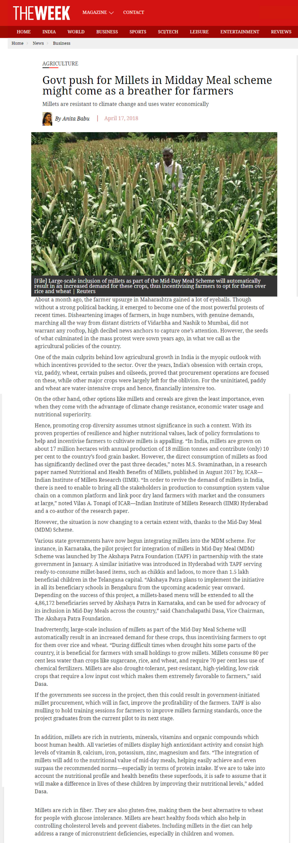 Millets in Midday Meal might come as a breather for farmers