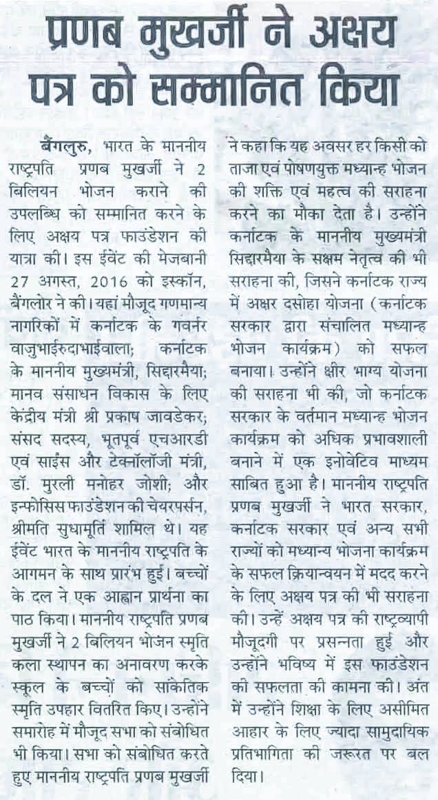 Pranab Mukherjee appreciates The Akshaya Patra Foundation