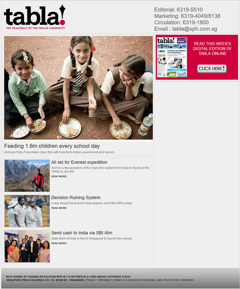 Front page story in Singapore supporting Akshaya Patra’s initiative